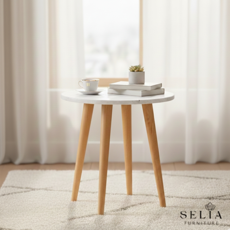 Kombinasi antara marble yang anggun dan kaki meja berbahan kayu jati solid menciptakan harmoni sempurna antara kemewahan dan keanggunan. Bentuk meja bulat tanpa sudut tajam menjamin keamanan anak saat bermain, sementara ukuran compact-nya ideal untuk menghemat space di sudut mana pun.